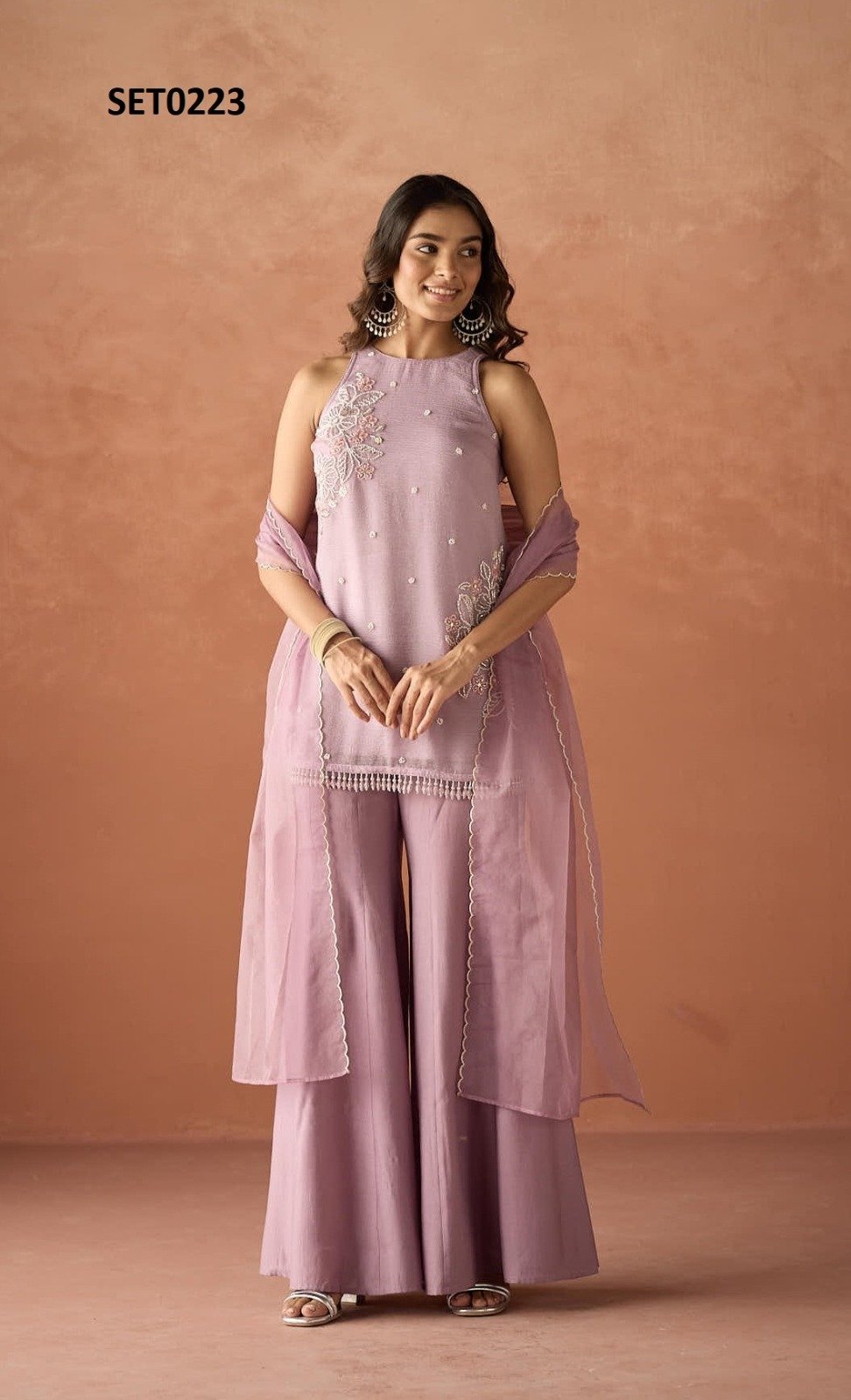 The Gulnaar Blush Palazzo Set features soft blush tones and elegant detailing, offering a graceful blend of comfort, tradition, and modern ethnic style.
